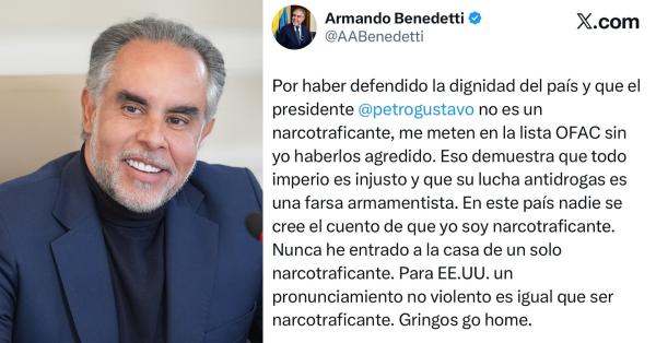 El ministro del Interior, Armando Benedetti, rechazó vehementemente su inclusión y la de la cúpula del Gobierno colombiano en la lista Clinton de EE. UU. en 2025, negando nexos con el narcotráfico y calificando la medida de "injusta" y un atentado a la dignidad nacional.