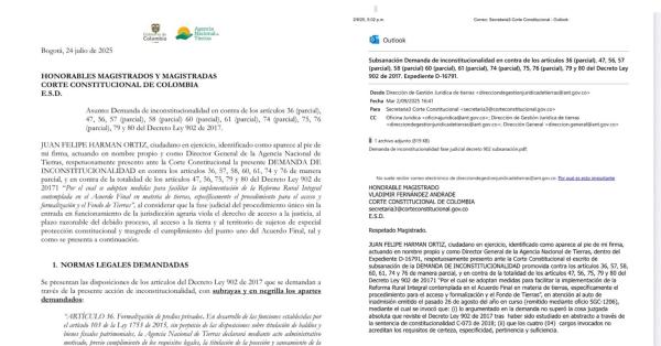La Corte Constitucional admitió en octubre de 2025 una demanda de la ANT contra el Decreto Ley 902 de 2017, buscando agilizar la Reforma Rural Integral y la justicia para el campo.