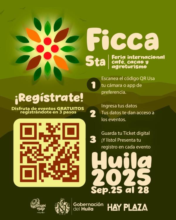Del 25 al 28 de septiembre, el Huila vibrará con la Feria Internacional de Café, Cacao y Agroturismo (FICCA 2025). Un evento gratuito que impulsa la economía local y proyecta la riqueza del departamento a nivel internacional.